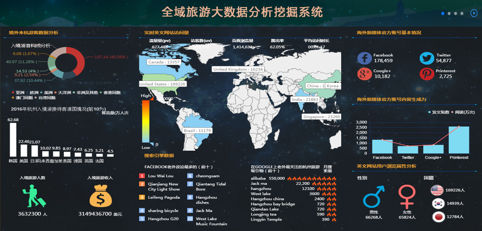 大數據展示的數據是對全域旅游大數據分析的總覽,并在系統的不同模塊中將旅游產業分析、旅游關注度分析、客源地分析、旅游目的地畫像、景區畫像、涉旅企業畫像、游客畫像的信息給展現出來。