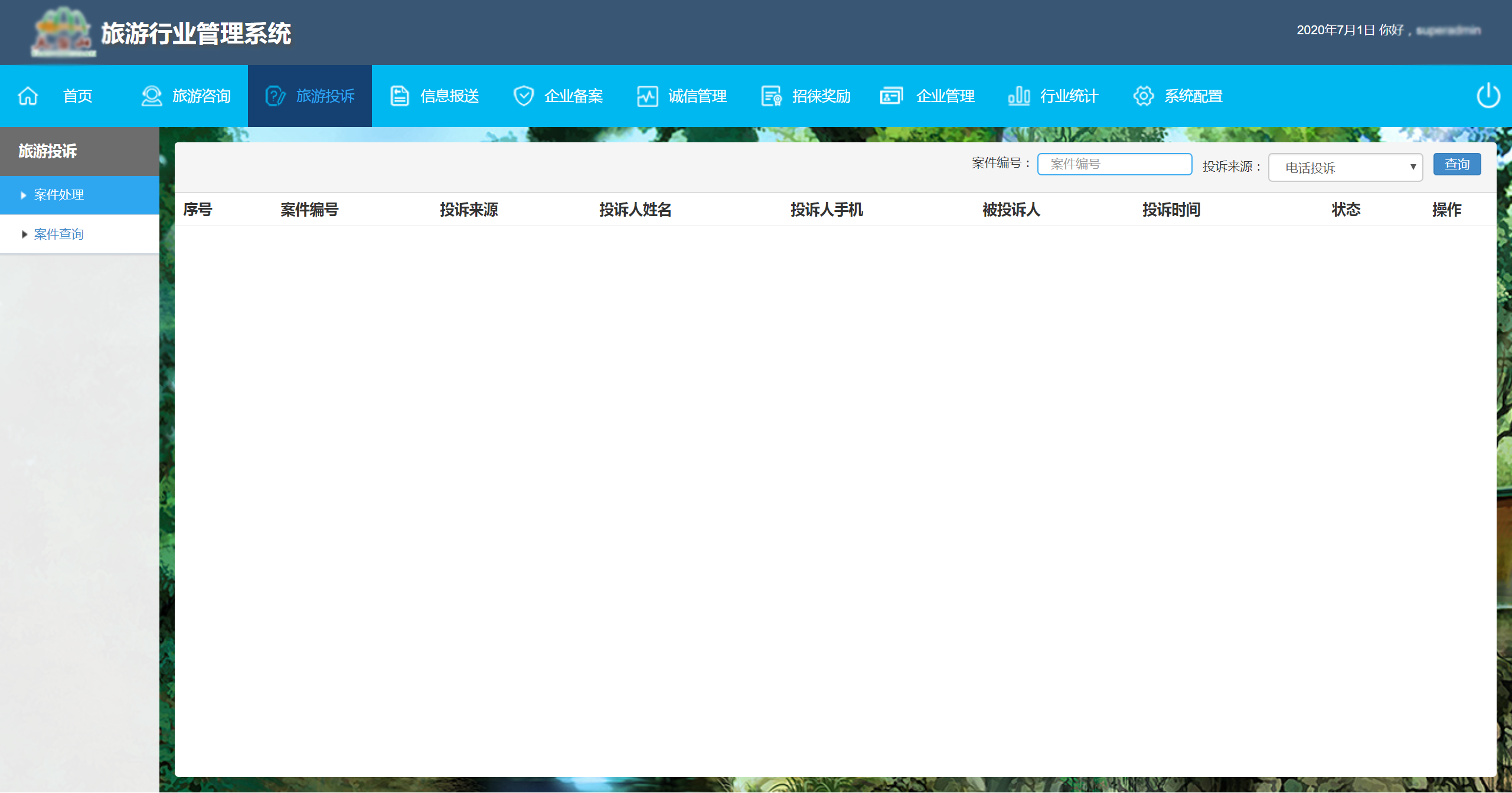 可為旅游服務質量的改善提供數據支持。可按不同查詢條件對投訴進行查詢統計:支持按旅行社、飯店、景區、等企業類別進行查詢;支持按具體的旅行社、飯店、景區、的企業名稱進行查詢;支持按年、月、日的時間段進行查詢。