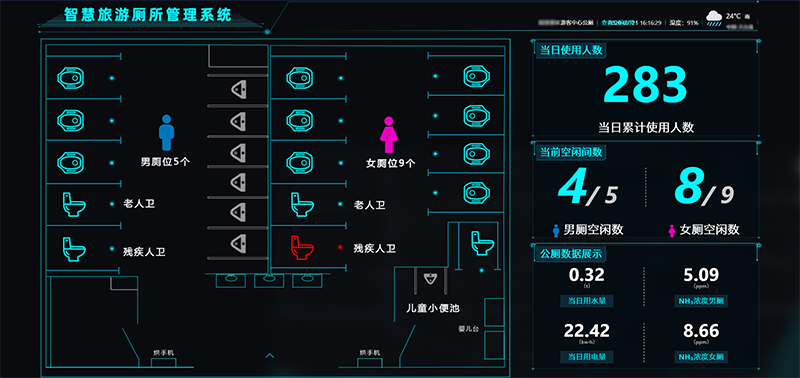 可以通過公廁外墻上的電子顯示屏,清晰的了解男、女廁和第三廁位分布情況,紅色亮起表示這個公廁目前有人使用。綠燈表示公廁空閑。通過這種直觀的方式就可以了解、判斷哪個廁位可用。公廁每個蹲位都安裝提供一鍵緊急呼叫按鈕,使用者按下呼叫鈴,工作人員將趕到廁所提供幫助。公廁門口架設蹲位顯示器,界面化的顯示廁所實際情況,同時還可以可投放第三方廣告商,第三方自動售貨機。