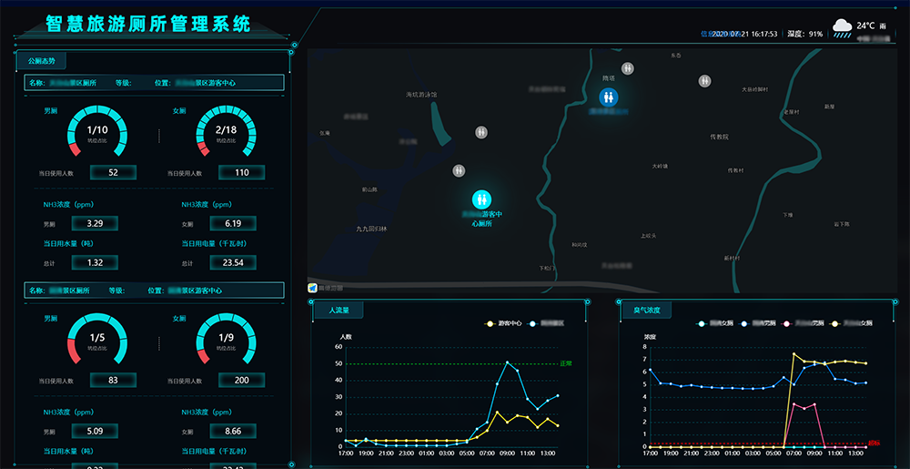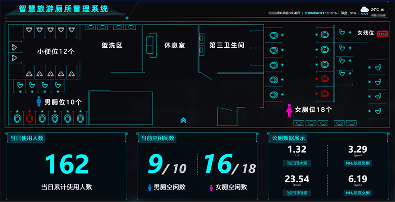 智能廁所系統基于4G、WIFI等無線通信技術,通過智能網關、無線設備,無線采集設備無線連接及控制設備,搭載相應的設備,如顯示屏、攝像頭、溫濕度傳感器、氣體傳感器一鍵告警、智慧照明等數據傳至云平臺,創建公廁管理數據庫,實現公廁環境、能耗、運維等方面的實時監管平臺,為實現公廁的智能化應用管理提供數據支撐。