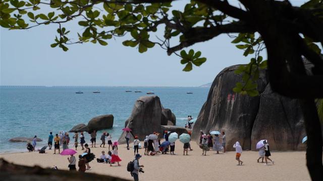 在海南省三亞市天涯海角旅游景區,游客在參觀游覽(4月13日攝)。 新華社記者 李夢嬌 攝
