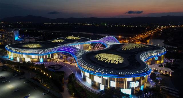 位于海南省三亞市海棠灣的三亞國際免稅城夜景(4月13日無人機拍攝)。 新華社記者 楊冠宇 攝