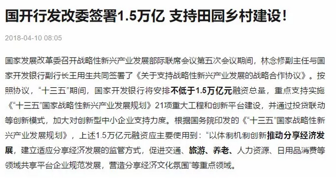國開行:國家開發(fā)銀行與發(fā)改委簽署 1.5 萬億協(xié)議,將用于農(nóng)村康養(yǎng)產(chǎn)業(yè)建設(shè)。