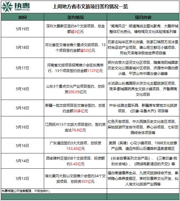 執惠不完全統計顯示,上周(5月13-19日),各地方省市文旅迎來大批量集中簽約,協議簽約金額共計1962億元,涵蓋河南、河北、湖北、廣東、山東、江西、陜西、新疆等區域,涉及80余個項目,囊括特色小鎮、主題公園、田園綜合體、實景演藝、溫泉度假區、遺址開發等多種業態。(如下圖所示)