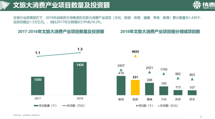 在各行業(yè)政策指引下,2018年由政府主導(dǎo)推進(jìn)的文旅大消費(fèi)產(chǎn)業(yè)項(xiàng)目:累計(jì)數(shù)量為1430個(gè),投資總額達(dá)1.3萬億元,相比2017年呈現(xiàn)出上漲趨勢。單獨(dú)的旅游板塊的項(xiàng)目數(shù)量為331個(gè),在這六大板塊里排名第二,而投資總金額高達(dá)4,820億元,傲居六大板塊之首。從中我們可以看出,宏觀市場在過去一年的反應(yīng)是積極響應(yīng)政策指引,資本也大量跟進(jìn)進(jìn)行重點(diǎn)布局。
