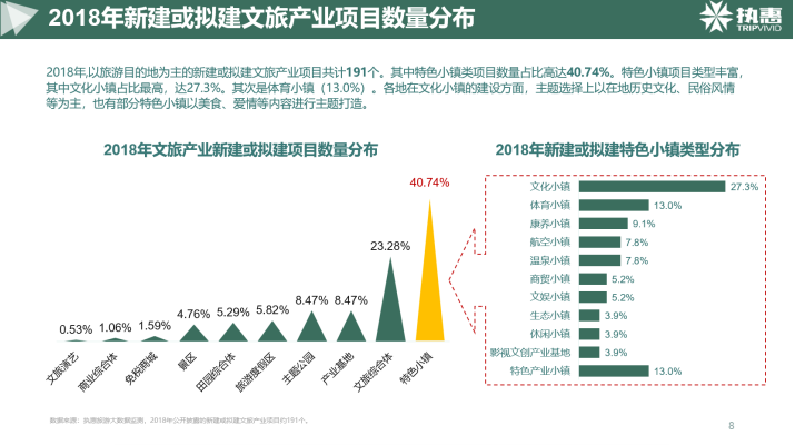 近年來,多個(gè)土地、金融、產(chǎn)融結(jié)合等政策的出臺(tái)有效帶動(dòng)了特色小鎮(zhèn)和文旅綜合體等目的地類項(xiàng)目的繁榮發(fā)展。從數(shù)量上看,2018年以旅游目的地為主新建或擬建文旅產(chǎn)業(yè)項(xiàng)目共計(jì)191個(gè),其中特色小鎮(zhèn)類項(xiàng)目數(shù)量占比高達(dá)40.74%,其次是文旅綜合體,占比23.28%。從投資金額上看,新建或擬建文旅綜合體項(xiàng)目投資總額高達(dá)2.24萬億,特色小鎮(zhèn)則是8,443億。