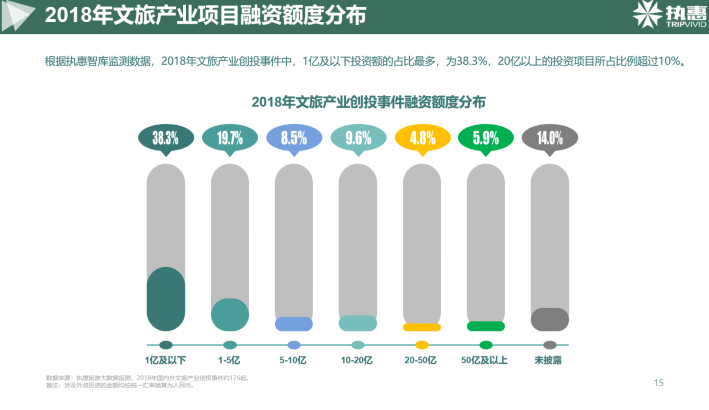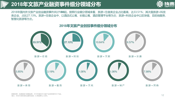 2018年國內(nèi)外文旅產(chǎn)業(yè)融資事件共計(jì)188起,那我們從這張圖上也能看出來資本市場在文旅大消費(fèi)在領(lǐng)域的綜合動(dòng)態(tài),其中投資旅游+住宿類項(xiàng)目融資占比最高,達(dá)33.51%;其次是旅游+科技類企業(yè),占比27.13%。