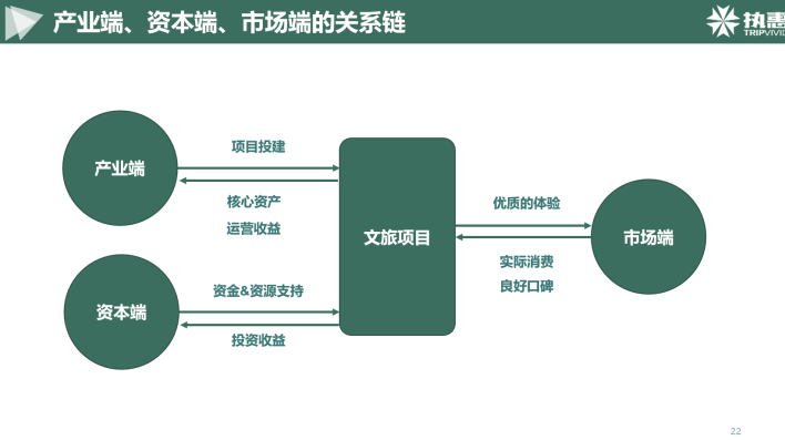我們總結(jié)了產(chǎn)業(yè)端、資本端、市場端三個(gè)維度的情況,我們可以梳理出他們之間的一條關(guān)系鏈。產(chǎn)業(yè)端的前期投建依托于資本端的支持與助力,通過文旅項(xiàng)目給市場端帶來的優(yōu)質(zhì)的體驗(yàn),從而形成實(shí)際消費(fèi)及良好的口碑,獲得最終的投資收益。對于產(chǎn)業(yè)端來說,這是一張項(xiàng)目發(fā)展結(jié)構(gòu)圖,對于資本端來說,這是一張現(xiàn)金流向圖。