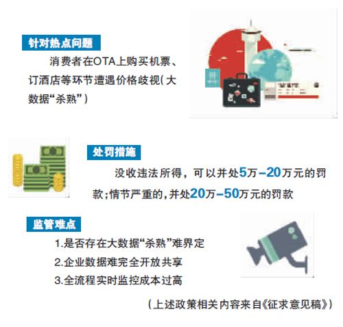 具體來說,《征求意見稿》明確了網(wǎng)絡新技術在旅游行業(yè)發(fā)展中的法律底線,對于大數(shù)據(jù)“殺熟”這一在線旅游服務行業(yè)中備受關注的焦點問題,《征求意見稿》擬規(guī)定,在線旅游經(jīng)營者不得利用大數(shù)據(jù)等技術手段,針對不同消費特征的旅游者,對同一產(chǎn)品或服務在相同條件下設置差異化的價格。如違反這一規(guī)定,由縣級以上文化和旅游行政部門依照《中華人民共和國電子商務法》第七十七條的規(guī)定處罰,即沒收違法所得,可以并處5萬-20萬元的罰款;情節(jié)嚴重的,并處20萬-50萬元的罰款。