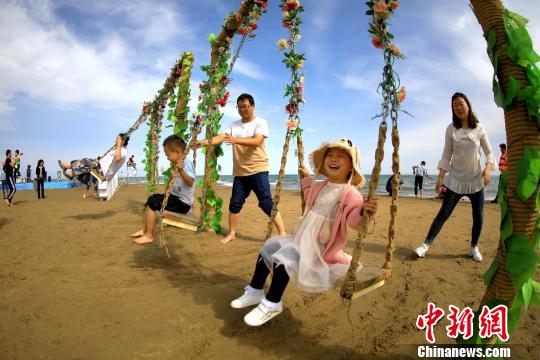 游客在博斯騰湖畔體驗(yàn)蕩秋千。 何陽(yáng) 攝