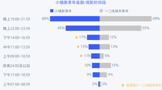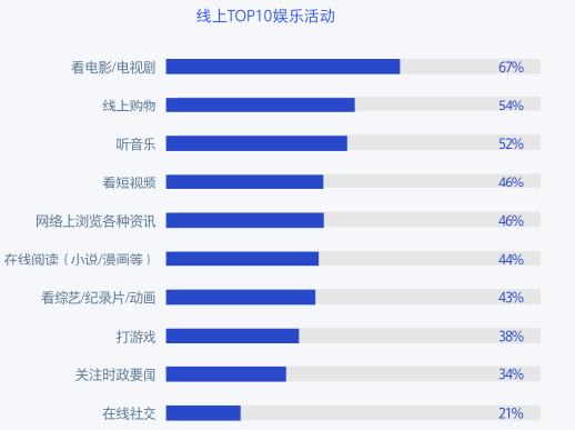 線上資源多元豐富,拉近線級(jí)之間的心理距離。隨時(shí)隨地可獲得的線上資源類型多元、內(nèi)容豐富,促使小鎮(zhèn)新青年在許多觀念和行為上逐漸與大城市看齊。小鎮(zhèn)新青年日均線上休 閑娛樂(lè)時(shí)長(zhǎng)為3 . 7 4小時(shí),看電影/電視劇和線上購(gòu)物,是小鎮(zhèn)新青年及一二線城市青年都最常進(jìn)行的線上娛樂(lè)活動(dòng)。