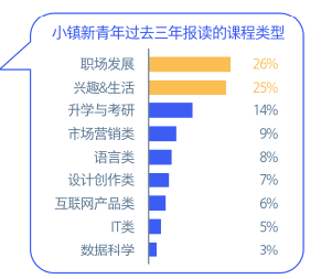 62%的小鎮(zhèn)新青年在過(guò)去三年曾報(bào)讀自我提升課程。實(shí)現(xiàn)升學(xué)&考研,滿足學(xué)習(xí)新知識(shí)的興趣愛(ài)好、提升職業(yè)技能是排名前三的課程選擇。