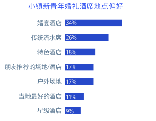 近半數(shù)的小鎮(zhèn)新青年認(rèn)為婚宴、婚禮、婚房缺一不可,58%的小鎮(zhèn)新青年在 婚房的需求上更傾向于一手房。小鎮(zhèn)新青年平均在婚禮/酒席上的花費(fèi)為42624元,低于一二線城市。在地點(diǎn)選擇上,他們更傾向于氛圍濃厚的婚宴酒店及傳統(tǒng)流水席
