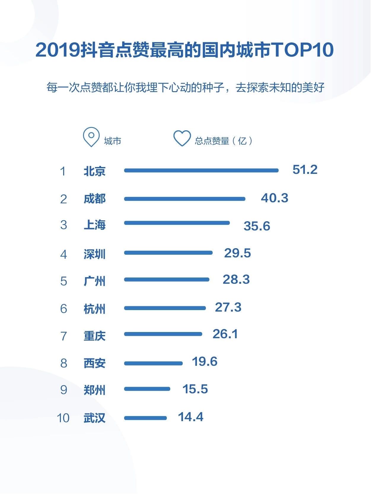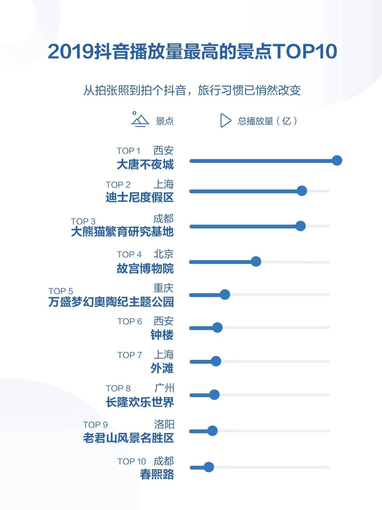 從過去拍張照片到現在“拍個短視頻”,人們的旅行習慣已悄然改變,這種習慣催生了文旅行業“打卡經濟”。根據抖音發布的數據,2019年,抖音用戶全球打卡6.6億次,最受歡迎的國外城市是曼谷、首爾和東京,被點贊最多的國內城市是北京、成都和上海。根據城市形象視頻點贊量,北京是2019年度“抖音之城”,收獲51.2億次點贊。
