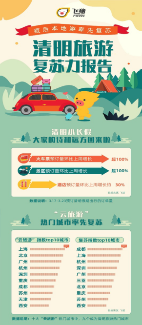 根據(jù)飛豬大數(shù)據(jù)顯示,清明出游熱門城市九成是“云旅游”熱門城市,旅游復(fù)蘇從云端走到線下,大批用戶計劃清明走出家門,“拔草”云旅游場景里的網(wǎng)紅酒店、樂園和景區(qū),踏青賞花看動物。