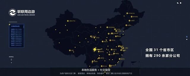 聯聯通過“本地生活服務+社交裂變”的商業營銷模式,除了為用戶提供“景區門票、度假酒店、特色餐飲”等周邊游產品服務外,更是不斷深耕本地生活服務領域,通過對本地消費者生活服務需求的深度研判,集合“休閑、娛樂、餐飲”等多個類目,打造本地生活服務平臺。從最初的西南地區的平臺起家,如今已經在31個省市區擁有290余家分公司。