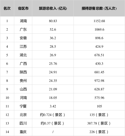 根據排行榜中的數據顯示,湖南以80.83億元列旅游總收入排行榜第一名,旅游總收入超過50億元的2省份分別為湖南和廣東,8省份接待游客總數超過500萬人次,分別是湖南、廣東、貴州、安徽、陜西、湖北、山西和河南。》》》查看其他排行情況