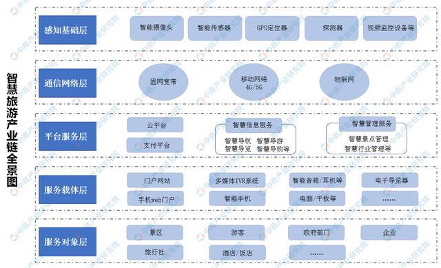 智慧旅游產業鏈所涉及的環節復雜、行業眾多,大大超出了傳統旅游行業的范疇。從結構來看,智慧旅游產業鏈中既有水平供需關系,也存在垂直協作關系。同時,隨著技術的不斷提升、需求更新,持續不斷有新的企業進入產業鏈。中商產業研究院整理了我國智慧旅游產業鏈圖主要包括:感知基礎層、通信網絡層、平臺服務層、服務載體層以及服務對象層五大層面,如下圖所示: