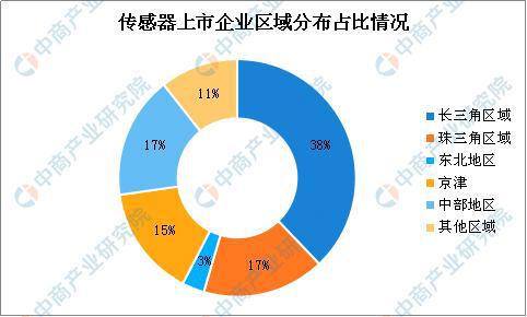 傳感器市場前景廣闊,國內企業紛紛布局其中。目前,我國傳感器上市企業多達66家,主要集中在長三角區域。此外,珠三角區域、京津地區、中部地區分布相當。據統計,長三角區域傳感器上市企業占比達38%,有企業25家;珠三角區域占比17%,有企業11家;中部地區同樣占比17%,有企業11家;京津地區占比15%,有企業10家;東北地區占比3%,有企業2家。