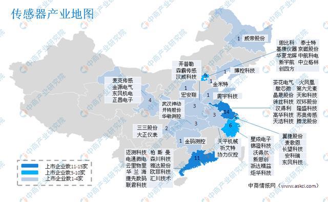 具體來看,長三角區域傳感器上市企業主要分布于江蘇、浙江、上海等地,;珠三角區域即分布于廣東省;中部地區主要分布于山西、河南、安徽、湖北等地。傳感器上市企業地圖如下: