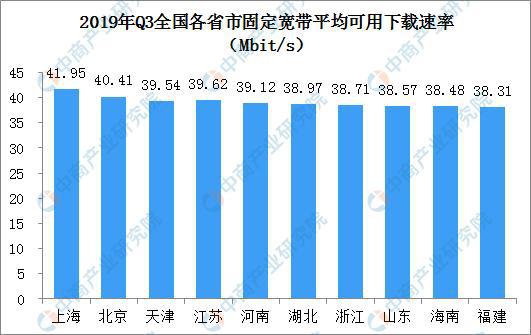 截至2019年第三季度,全國光纖寬帶用戶占比超過91%,寬帶用戶持續向高速率遷移,100Mbps及以上接入速率的固定互聯網寬帶接入用戶已占總用戶數的80.5%;4G用戶占移動電話用戶已達79.1%,這些指標均位居全球前列。固定寬帶下載速率方面,上海、北京、天津位列全國前三位,且上海、北京已率先超過了40Mbit/s,江蘇、河南緊隨其后。全國主要城市排行榜上,上海、北京、南京、鄭州、天津位居前五位。