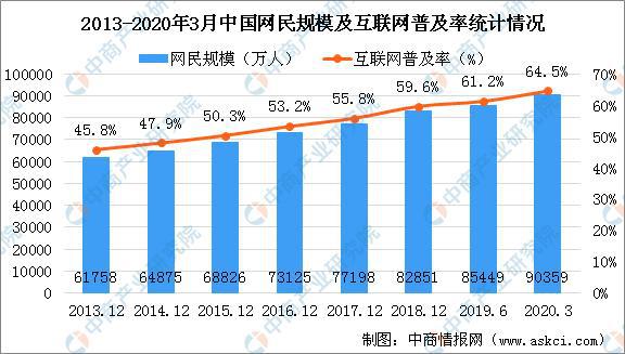隨著智能手機的大力推廣和普及,推動著移動互聯網市場規模的進一步擴張,用戶規模不斷攀升。互聯網行業持續穩健發展,互聯網已成為推動我國經濟社會發展的重要力量。據《中國互聯網絡發展狀況統計報告》數據顯示:截至2020年3月28,我國網民規模為9.04億,較2018年底新增網民7508萬,互聯網普及率達64.5%,較2018年底提升4.9個百分點。