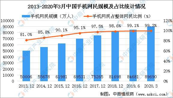 截至2020年3月,我國手機網民規模為8.97億,較2018年底新增手機網民7992萬,網民中使用手機上網的比例為99.3%,較2018年底提升0.7個百分點。