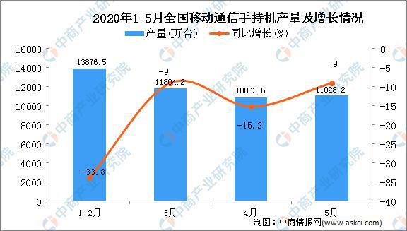 據中商產業研究院數據庫顯示,2020年5月全國移動通信手持機產量下降,2020年5月全國移動通信手持機產量為11028.2萬臺,同比下降9%。2020年1-5月全國移動通信手持機產量為46323.9萬臺,同比下降16.5%。