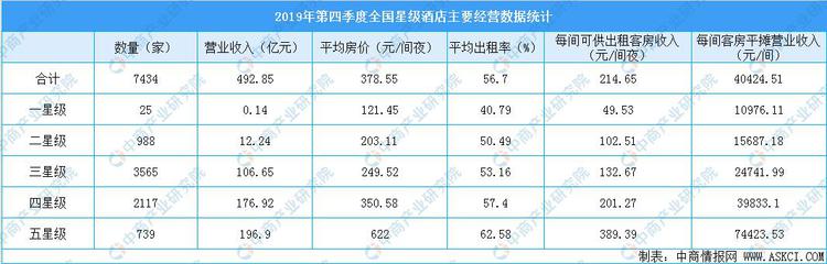 根據文化和旅游部數據顯示,到2019年第四季度,全國星級飯店統計管理系統中共有星級飯店10130家。共有7434家星級飯店通過省級文化和旅游行政部門審核,其中包括一星級25家,二星級988家,三星級3565家,四星級2117家,五星級739家。