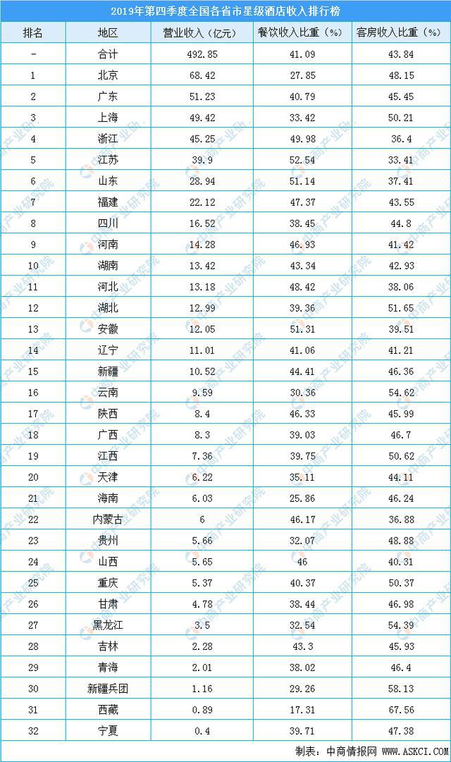 從2019第四季度各地區星級酒店經營情況看,共有2個地區營收超50億元,分別是北京68.42億元,其中餐飲收入占比27.85%,客房收入占比48.15%;廣東521.23億元排名第二。上海市195家星級酒店實現營業收入49.42億元,排名第三。另外,全國共有15個地區營收超10億元。