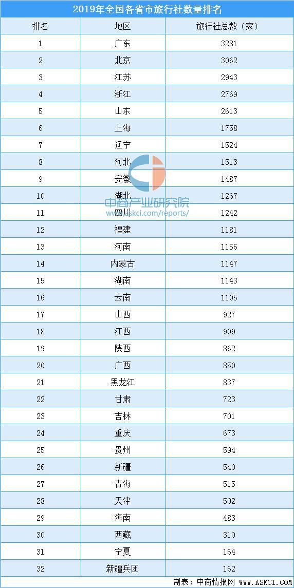從全國旅行社分布來看,東部地區和西部地區旅行社數量較多,合計占全國旅行社總量超70%。旅行社數量在2500家以上的有5個地區,分別為廣東、北京、江蘇、浙江和山東,數量最多的廣東為3281家。海南、西藏、寧夏、新疆兵團4個地區旅行社數量少于500家,最少的新疆兵團為162家。旅行社數量在500-1000家的有12個地區,1000-1500家的有8個地區,1500-2000家的有3個地區。2019年全國各省市旅行社數量排名如下: