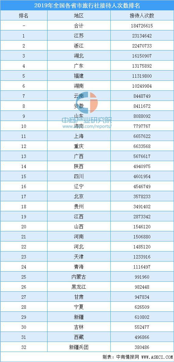 從各省市旅行社接待人次數來看,2019年全國旅行社共接待人數18472.66萬人次。從接待人次來看,江蘇省接待游客人數最多,全年共接待人數2313.46萬人次,位列全國第一。浙江接待人次2247.07萬人次,排名第二位。湖北以接待人數1615.09萬人次排名第三位。2019年全國各省市旅行社接待人次數排名如下: