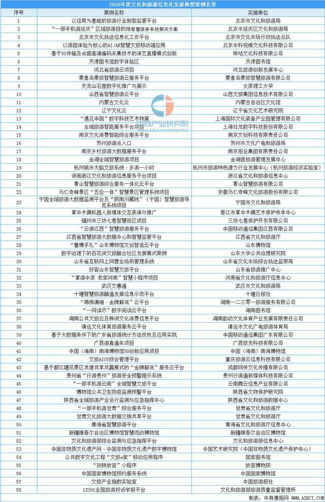近日,文化和旅游部科技司發布了《2020年度文化和旅游信息化發展典型案例名單》,確定“以信用為基礎的旅游行業新型監管平臺”等58個案例為2020年度文化和旅游信息化發展典型案例。