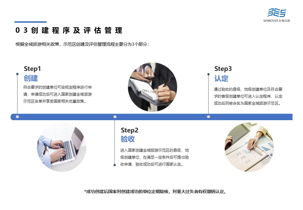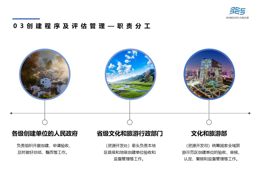 根據(jù)全域旅游相關(guān)政策,示范區(qū)創(chuàng)建及評估管理流程主要分為3個部分:即創(chuàng)建——驗(yàn)收——認(rèn)定。各級創(chuàng)建單位的人民政府,負(fù)責(zé)組織開展創(chuàng)建、申請驗(yàn)收,及時做好總結(jié)、整改等工作;省級文化和旅游行政部門牽頭負(fù)責(zé)本地區(qū)縣級和地級創(chuàng)建單位驗(yàn)收和監(jiān)督管理等工作;文化和旅游部統(tǒng)籌國家全域旅游示范區(qū)創(chuàng)建單位的驗(yàn)收、審核、認(rèn)定、復(fù)核和監(jiān)督管理等工作。
