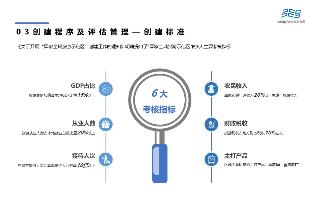根據(jù)規(guī)定,各地首批申報,原則上不超過10%左右的縣(含縣級市),有條件省份可適當(dāng)申報市(地州)為創(chuàng)建對象。創(chuàng)建主體為縣、市地州人民政府。《關(guān)于開展“國家全域旅游示范區(qū)”創(chuàng)建工作的通知》明確提出了“國家全域旅游示范區(qū)”的6大主要考核指標(biāo)包括:GDP占比、從業(yè)人數(shù)、接待人次、農(nóng)民收入、財政稅收以及主打產(chǎn)品。