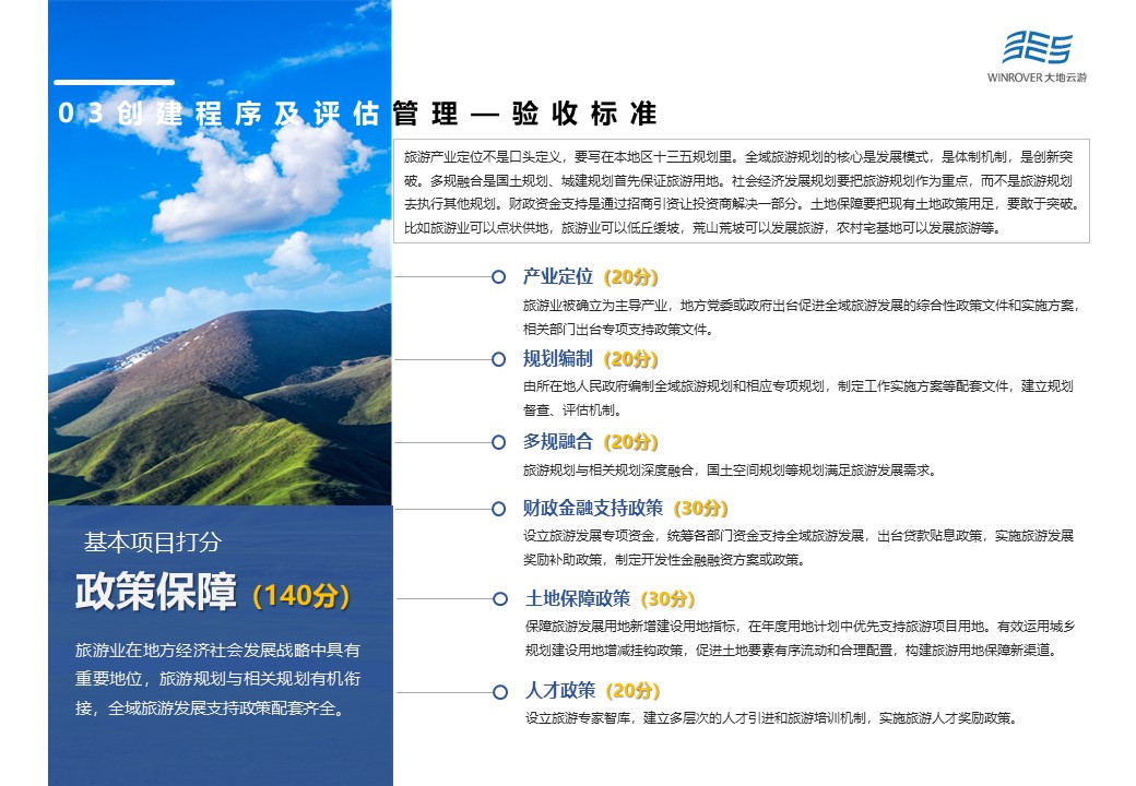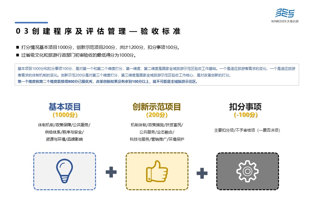 驗(yàn)收標(biāo)準(zhǔn)打分包含基本項(xiàng)目1000分,創(chuàng)新示范項(xiàng)目200分,以及扣分事項(xiàng)100分。其中,基本項(xiàng)目與扣分事項(xiàng)是國家全域旅游示范區(qū)驗(yàn)收工作基礎(chǔ)。一個是適應(yīng)旅游者需求的變化,一個是適應(yīng)旅游者需求的體制機(jī)制的變化。而創(chuàng)新示范項(xiàng)目是國家全域旅游示范區(qū)驗(yàn)收工作核心,是對改革創(chuàng)新的打分。基本項(xiàng)目與扣分事項(xiàng)能夠得900分已屬優(yōu)秀,改革創(chuàng)新如果沒有拿到100分以上,就不可能是全域旅游示范區(qū)。