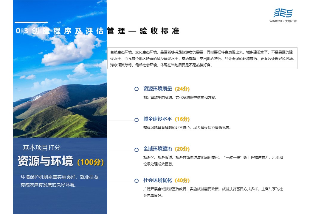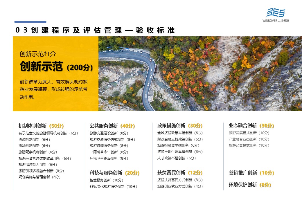 創(chuàng)新示范項(xiàng)目由機(jī)制體制創(chuàng)新(50分)、公共服務(wù)創(chuàng)新(40分)、科技與服務(wù)創(chuàng)新(20分)、政策措施創(chuàng)新(30分)、扶貧富民創(chuàng)新(12分)、業(yè)態(tài)融合創(chuàng)新(30分)、營銷推廣創(chuàng)新(10分)以及環(huán)境保護(hù)創(chuàng)新(8分)等8項(xiàng)構(gòu)成。創(chuàng)新改革力度大,有效解決制約旅游業(yè)發(fā)展瓶頸,形成較強(qiáng)的示范帶動作用,是驗(yàn)收得分的重點(diǎn)。