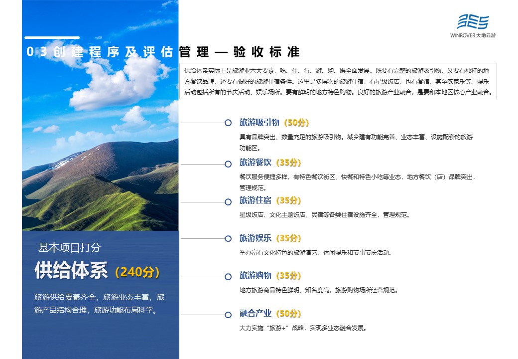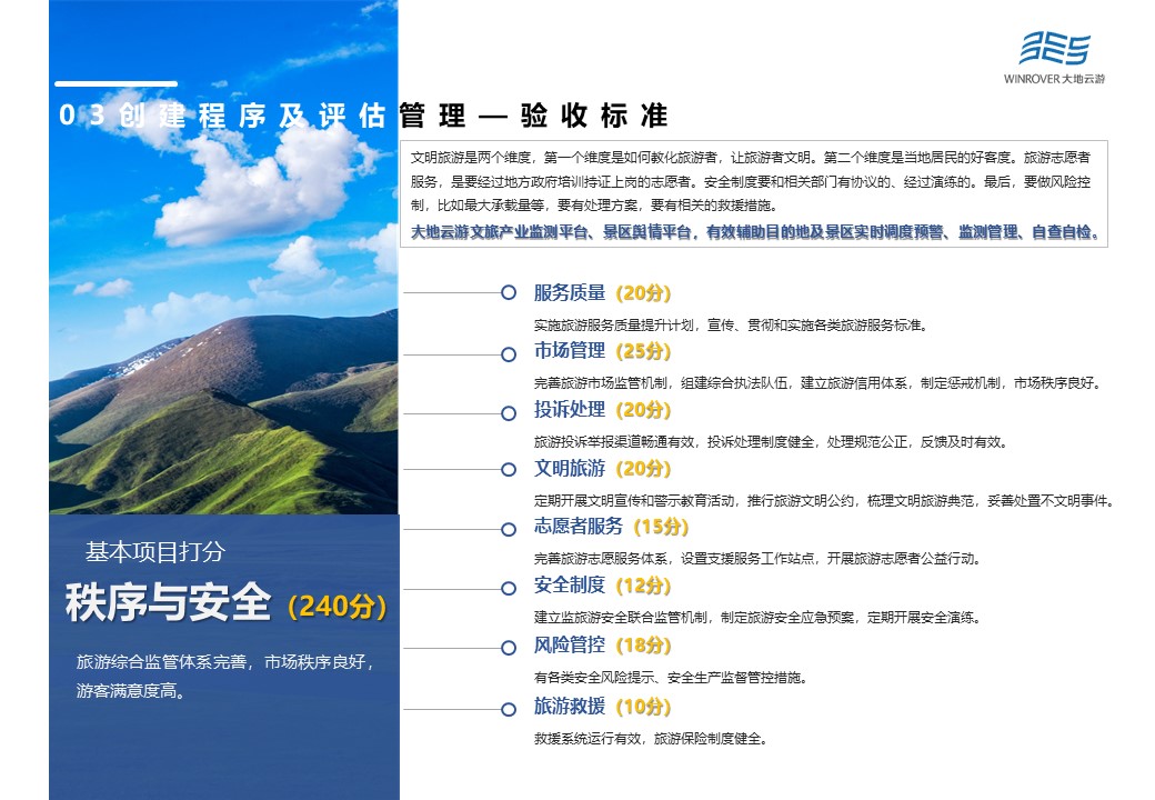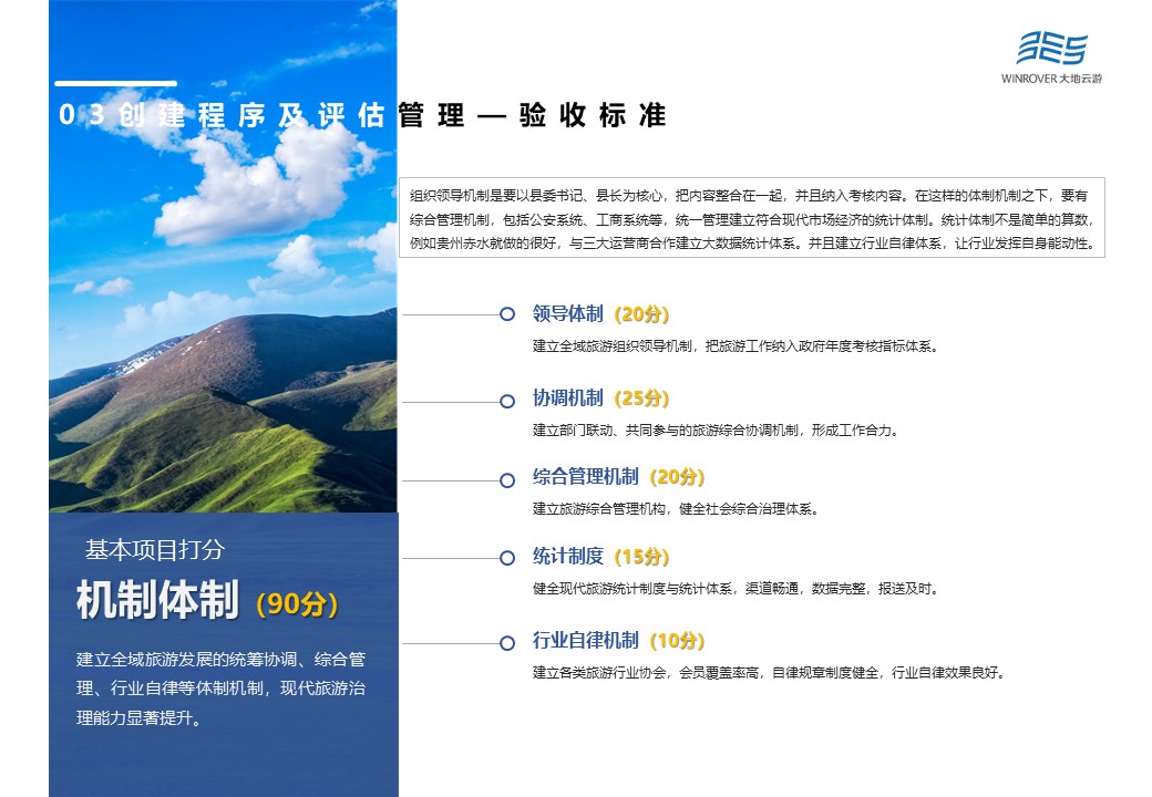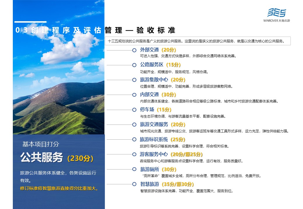其中,基本打分項(xiàng)目主要由機(jī)制體制(90分)、政策保障(140分)、公共服務(wù)(230分)、供給體系(240分)、秩序與安全(240分)、資源與環(huán)境(100分)、品牌影響(60分)等7大項(xiàng)構(gòu)成。根據(jù)最新修訂結(jié)果,將公共服務(wù)中游客服務(wù)中心的25分,降為20分,同時加大智慧旅游分?jǐn)?shù)占比,將原本的30分,提升為35分。