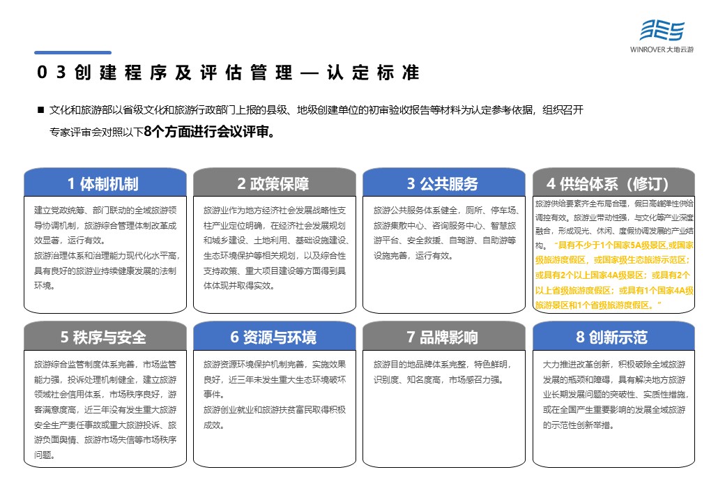 文化和旅游部以省級文化和旅游行政部門上報的縣級、地級創(chuàng)建單位的初審驗(yàn)收報告等材料為認(rèn)定參考依據(jù),組織召開專家評審會對體制機(jī)制、政策保障、公共服務(wù)、供給體系、秩序與安全、資源與環(huán)境、品牌影響以及創(chuàng)新示范等8個方面進(jìn)行會議評審。根據(jù)最新修訂結(jié)果,認(rèn)定標(biāo)準(zhǔn)在供給體系方面進(jìn)行了適當(dāng)“放寬”,將“具有不少于1個國家5A級旅游景區(qū),或國家級旅游度假區(qū),或國家級生態(tài)旅游示范區(qū);或具有2個以上國家4A級旅游景區(qū)”修改為“具有不少于1個國家5A級景區(qū),或國家級旅游度假區(qū),或國家級生態(tài)旅游示范區(qū);或具有2個以上國家4A級景區(qū);或具有2個以上省級旅游度假區(qū);或具有1個國家4A級旅游景區(qū)和1個省級旅游度假區(qū)。”