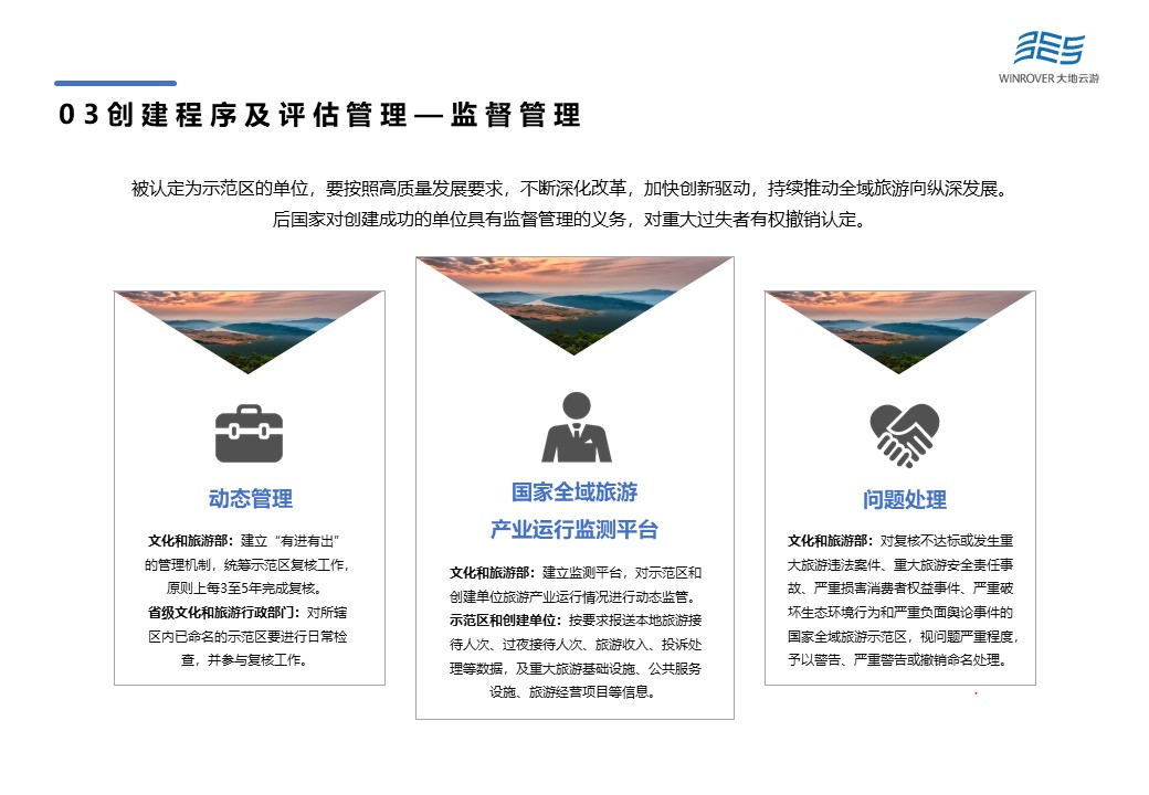 國家全域旅游示范區(qū)采用“有進(jìn)有出”的動態(tài)管理機(jī)制,原則上每3至5年完成復(fù)核。被認(rèn)定為示范區(qū)的單位,要按照高質(zhì)量發(fā)展要求,不斷深化改革,加快創(chuàng)新驅(qū)動,持續(xù)推動全域旅游向縱深發(fā)展,否則對重大過失者有權(quán)撤銷認(rèn)定。