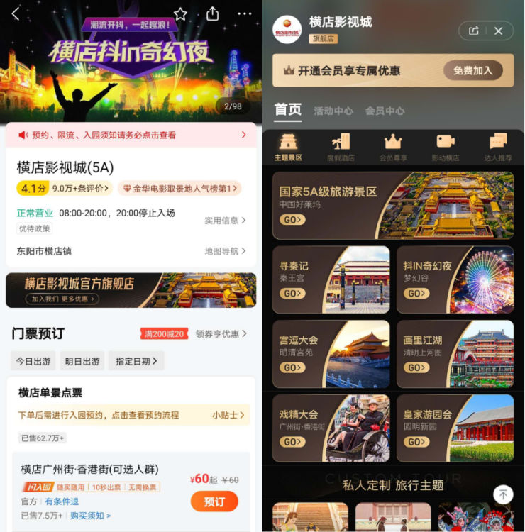 同時,結(jié)合橫店影視IP,橫店影視城會員旗艦店還為不同的會員群體量身定制了游橫店的主題旅行項目,如朋友閨蜜游、劇中人物體驗游、情侶浪漫游、暖心父母游、家庭親子度假游等。追星達人還可以搶購爆款橫店劇組見面會門票,來場影視追劇游。在橫店影視城會員旗艦店里,將圍繞其“影視基因”結(jié)合影視主題酒店、經(jīng)典景區(qū)和特色美食,傳達橫店影視城玩在電影里、住在電影里、吃在電影里、購在電影里的“影視體驗度假區(qū)”品牌形象。