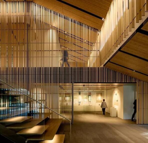 建筑層高低矮,主要材料是鋼和玻璃,立面和內(nèi)部裝飾大部分采用當?shù)啬静模c環(huán)境完美協(xié)調。室內(nèi)景觀,隈研吾也以自己一貫的風格做了設計:若有似無的空間隔斷、視野開闊的大面落地窗、簡潔但充滿細節(jié)的空間布局。