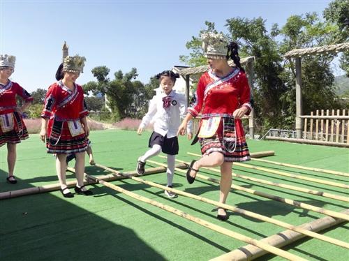 在塢根鎮喜柿山谷,游客學跳竹竿舞。