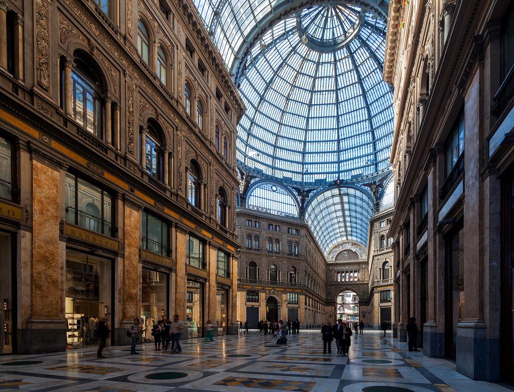 冬日的暖陽下,地中海的海風(fēng)穿過意大利那不勒斯王宮廣場,吹進翁貝托一世長廊。長廊外部設(shè)有4個巨大的入口拱門,內(nèi)部兩條步行街呈十字形交叉。透過泛著蔚藍色的玻璃穹頂,陽光灑進步行街。始建于1887年的翁貝托一世長廊,是意大利最具代表性的商業(yè)步行街之一。