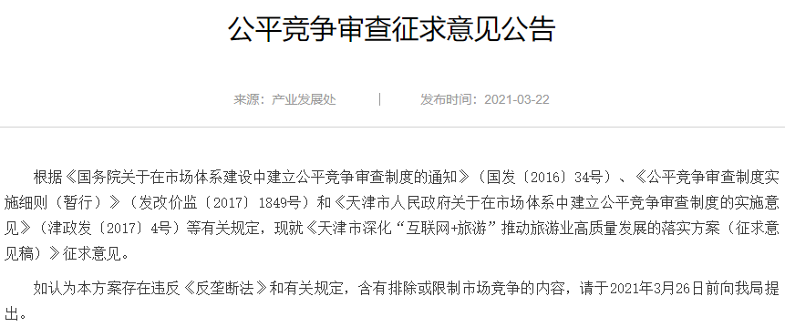 日前,《天津市深化“互聯網+旅游”推動旅游業高質量發展的落實方案》在天津市文化和旅游局網站公開征求意見,方案提出推動國有旅游景區,于2021年底前全部提供在線預約預訂服務。
