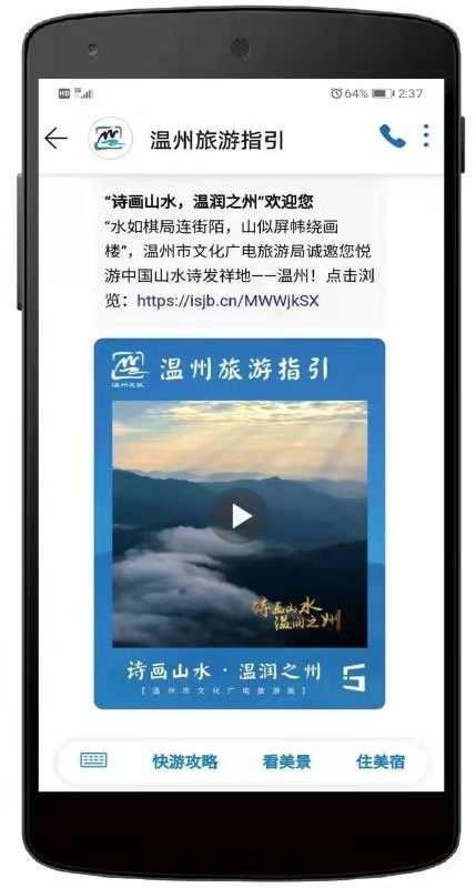 自《溫州旅游指引》上線以來,引起了用戶的廣泛關注,在文旅行業也成為熱門話題。來溫參加“詩畫溫州,溫潤之州”長三角職工療休養交流大會的上海用戶徐先生說,我到溫州雁蕩山參加療休養交流大會,一下動車就收到溫州文旅推送的“詩畫山水,溫潤之州—歡迎您”手機消息,感覺不錯。以前到過很多城市,收到過文字版的歡迎短信,這次在溫州收到的這種帶高清視頻的消息,體驗感更好,獲取的信息更全面,點擊翻閱里面內容,也正是我想了解的。其中的“美景”“美食”“美宿”版塊內容對我最有吸引力,我很想品品地道的溫州小吃,看看溫州的夜景。
