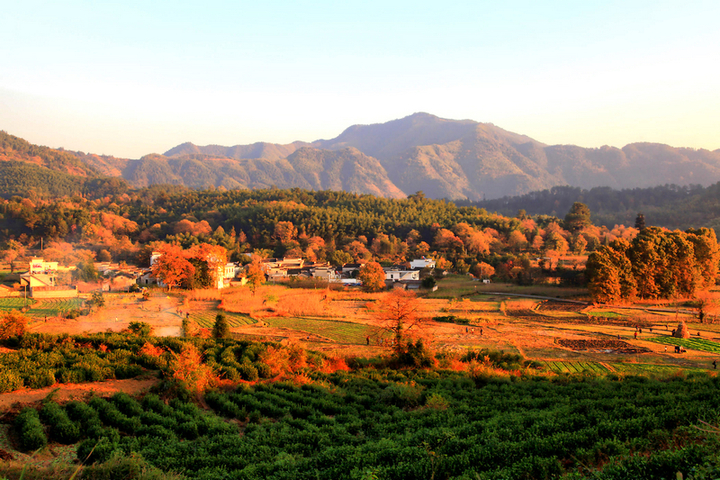 每到秋天,村落田野中錯落有致的烏桕樹葉子紅了,形成一幅迷人的田園風光畫卷,塔川秋色也因此得名,并名揚四海。塔川烏桕樹經過霜降,由綠變黃,由黃變紅,中間呈七彩顏色。塔川的清晨最美,薄薄的霧氣籠罩在樹上,似有似無,農家的小屋若隱若現,紅楓叢中忽露出飛檐翹角,粉墻黛瓦在金黃葉子的掩映下,就如中國山水畫般詩情畫意。