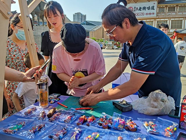 一個是面塑作品,一個是版畫藝術;一位是非遺傳承人,一位是21歲的在校大學生。不久前,在陜西西安大唐市金市廣場上的西安市非遺項目文創研發展示活動現場,一位來自西安美術學院多位學子的作美術作品受到廣大市民和游客的關注。所有作品不僅展示了青年畫家對于非遺的觀察和理解,同樣成為傳統手藝的當代宣傳畫,頗具觀賞性及廣告價值。