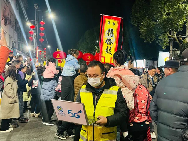 2月1日,“中國狀元縣”——休寧縣隆重開展“鼓迎新春龍騰狀元城”傳統民俗表演活動,華燈璀璨、張燈結彩、人頭攢動、熱鬧非凡,游客和村民前來感受非遺傳統文化。為保障活動期間通信暢通,安徽移動休寧分公司組織志愿服務小分隊,對狀元古城實現5G全覆蓋,提前對狀元街、狀元博物館等活動周邊區域進行多輪測試和設備巡檢,對4G/5G網絡進行擴容,進行現場網絡保障。