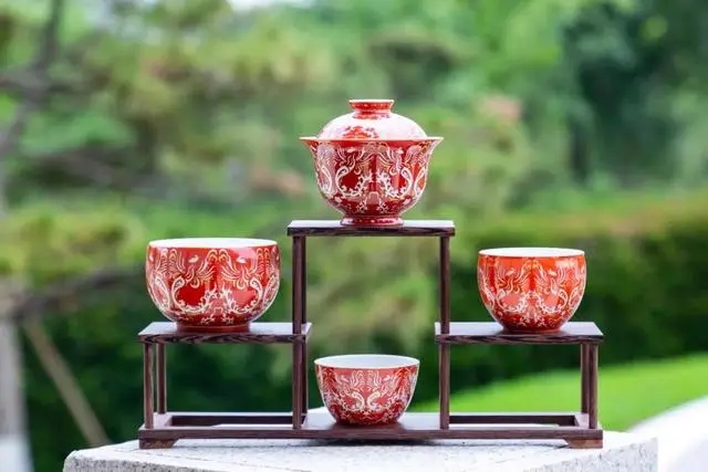 其中,粉彩錯金銀虎嘯鳳吟系列,是一件不可多得的佳器名品。整套茶具紋飾以館藏文物唐代金鳳飾件為設計靈感。金鳳雙翅展開,兩足蹬地,振翅欲飛的姿態生動逼真。在中國古代傳統文化中,鳳凰被視為瑞鳥,是鳥中之王。通過對金鳳飾件進行提取,設計出鸞鳥紋,鳳紋羽翼展開可合為院徽圖形,整體構成虎頭紋。茶具沿用藝林堂的粉彩工藝,采用錯金銀的呈現效果,不僅讓這只“鳳”更有“活性”,也讓器物更有精細感,正紅的底色也呈現出“紫禁紅”“中國紅”的極佳效果,在保留和傳播傳統文化的同時,也符合當下的審美需求。